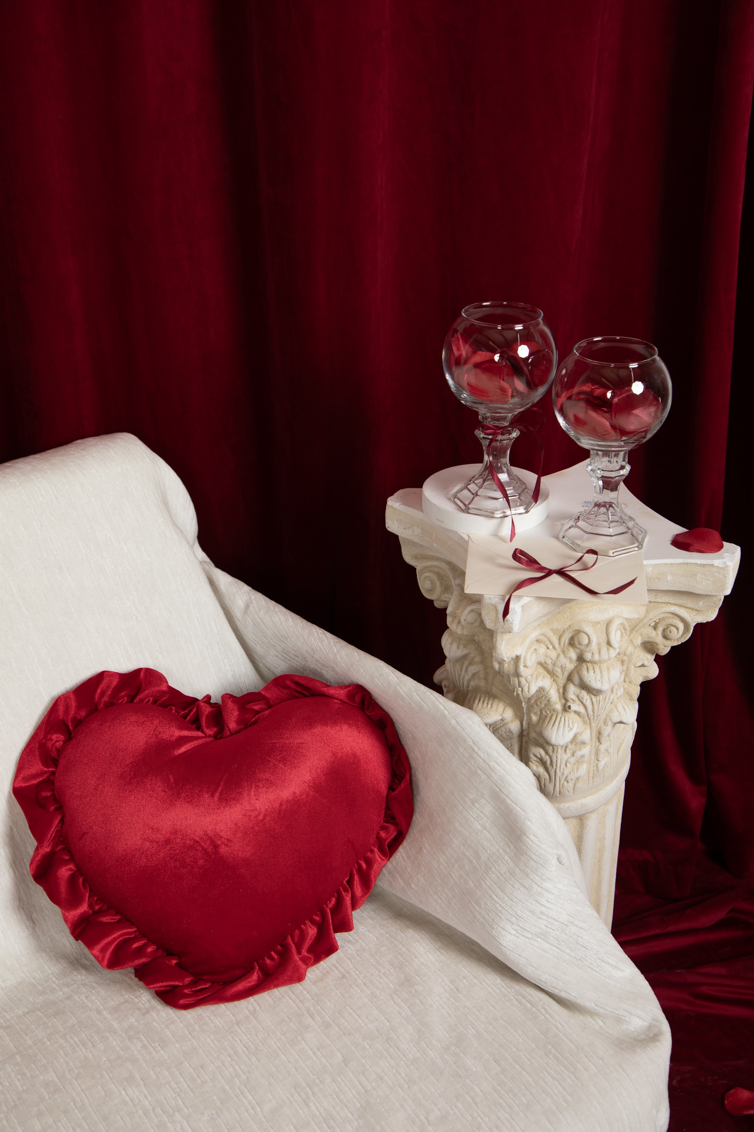 We have a red heart cutout prop, a red Y2K inspired airbrushed hearts backdrop, rose gold drapes, and a plain white and red backdrop.